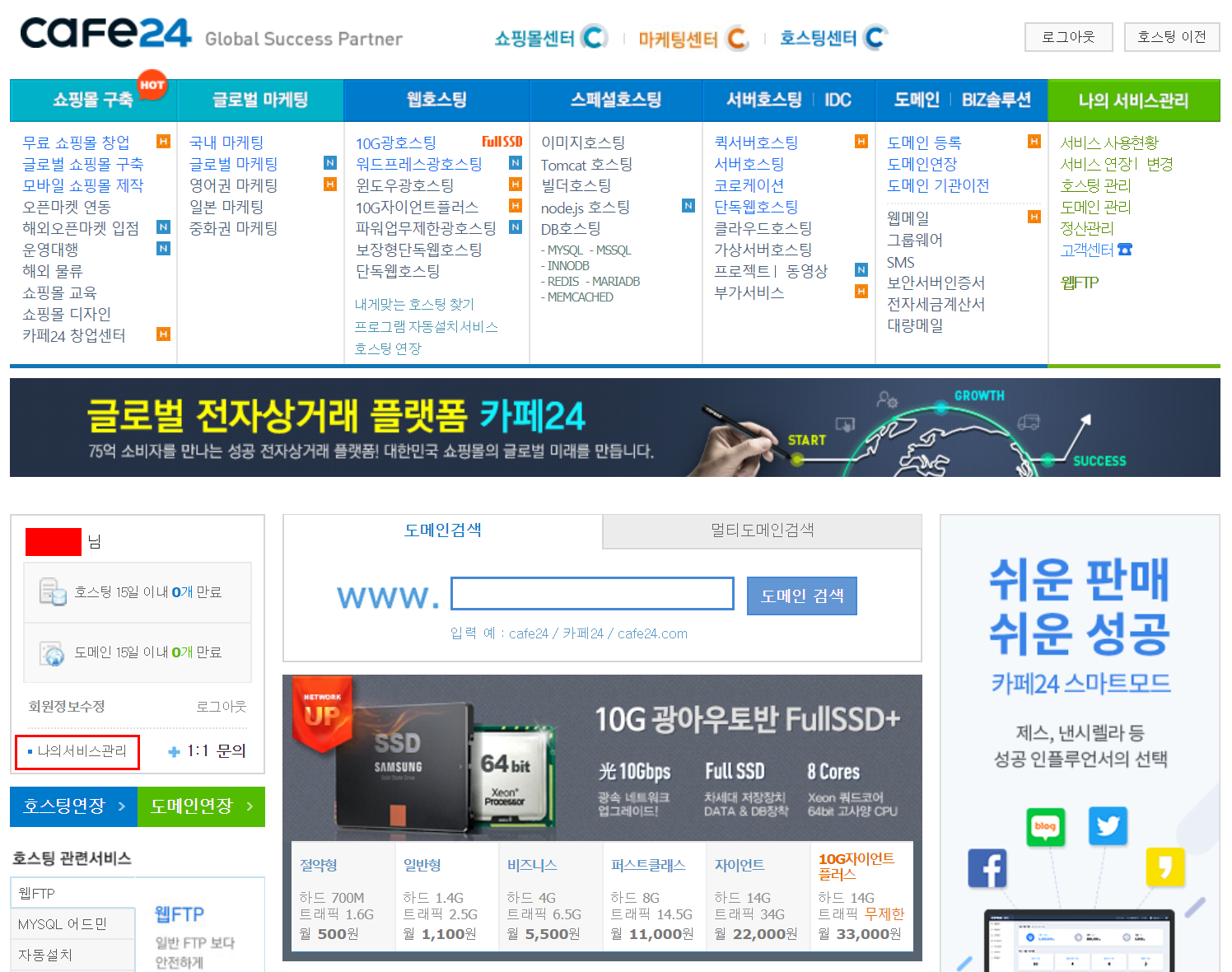 카페24 에서 도메인을 구매한 뒤 로그인해 줍니다.